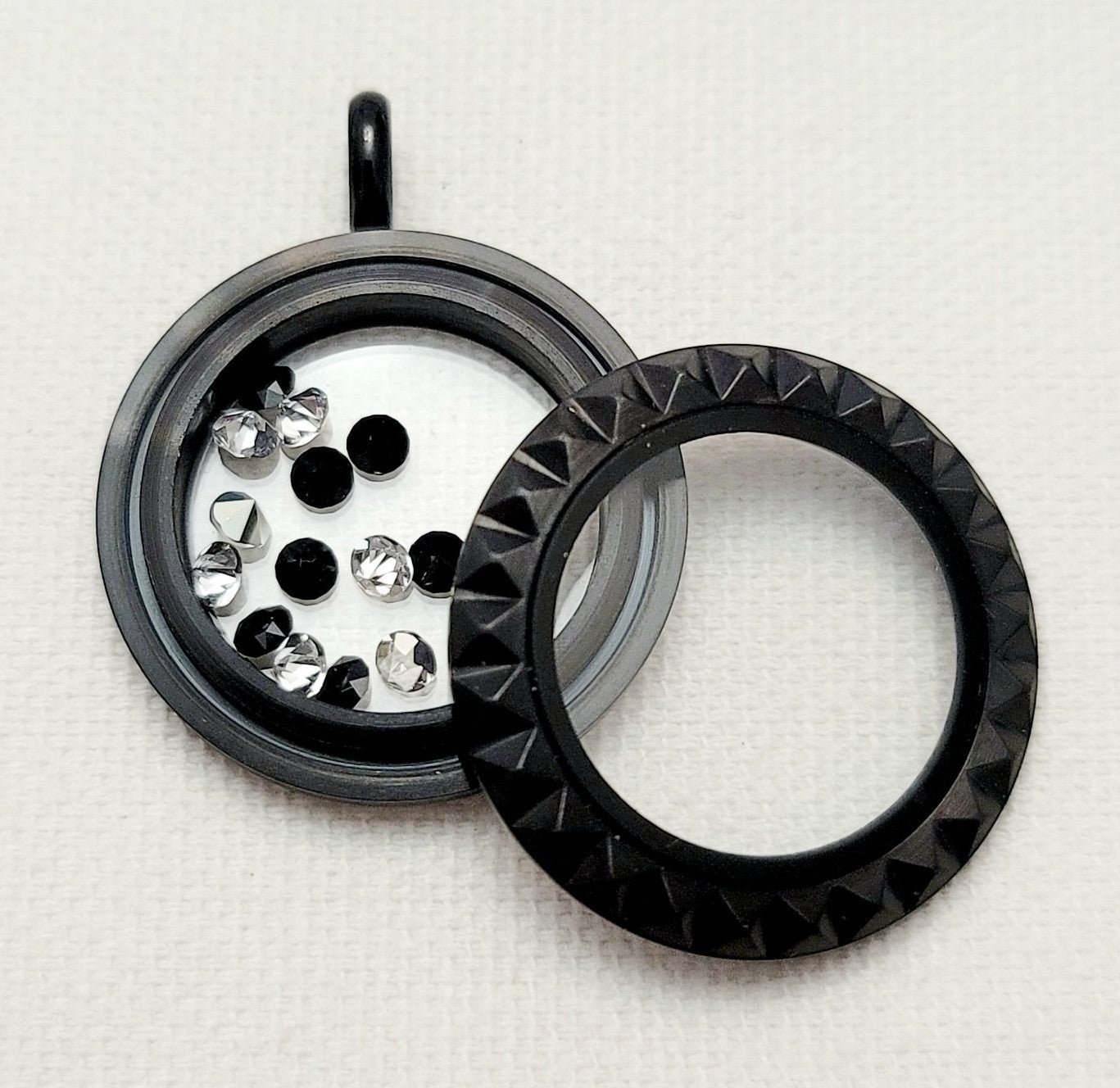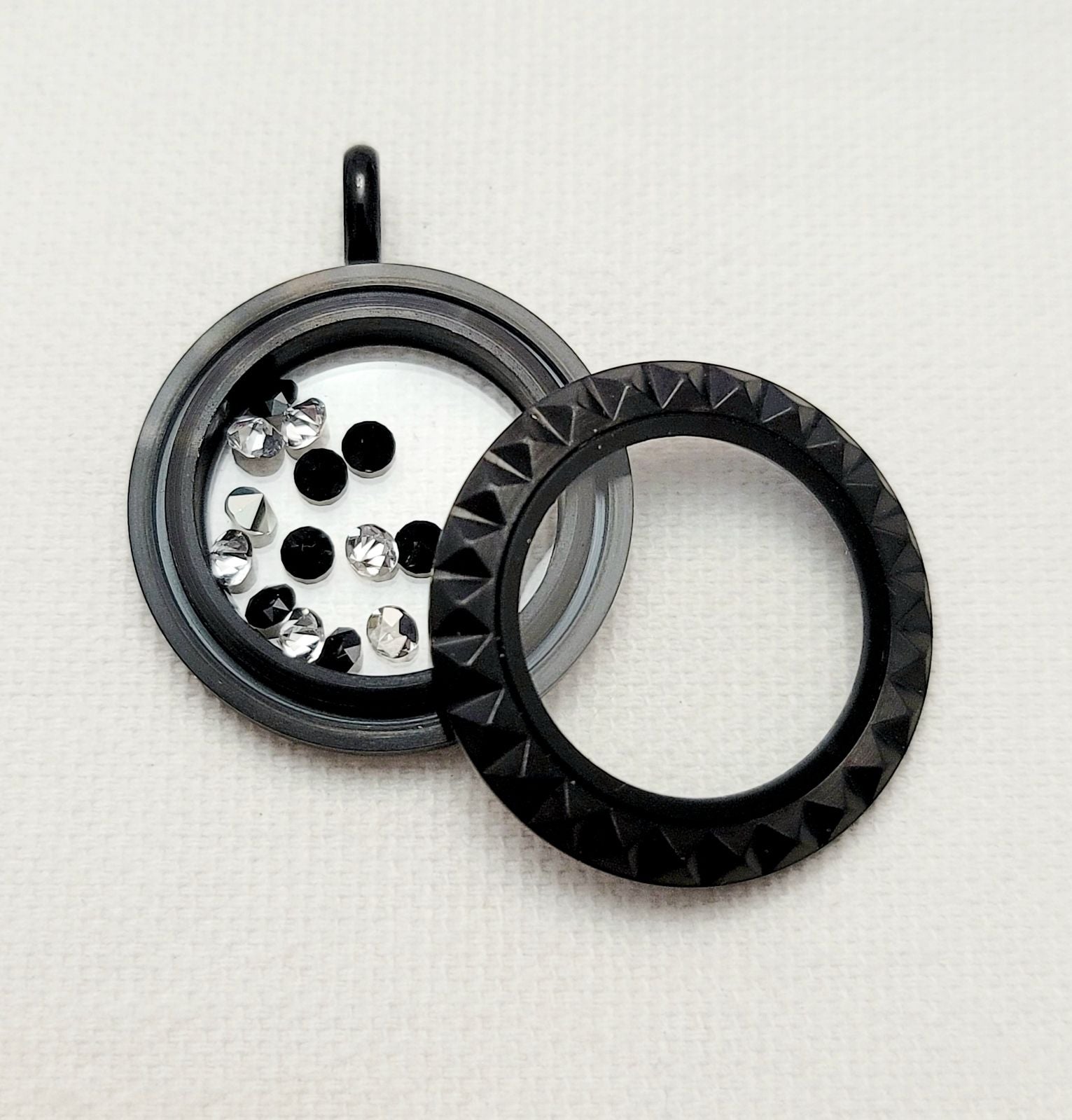 This floating locket listing includes the pictured medium black pyramid studded twist living locket face, a medium black twist locket base, and a custom mix of Swarovski stardust crystals.